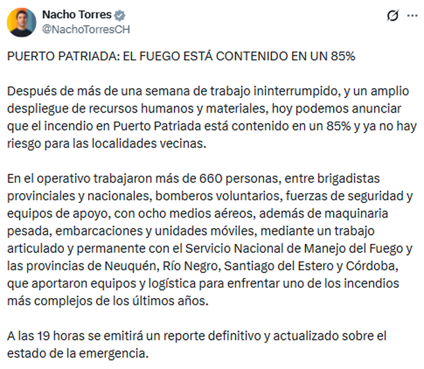 Pasado el mediodía de este miércoles, Ignacio Torres -gobernador de la provincia de Chubut- dio una gran noticia a través de sus redes sociales: el fuego está contenido en un 85% en Puerto Patriada, tras el desastre que dejaron los incendios forestales.
