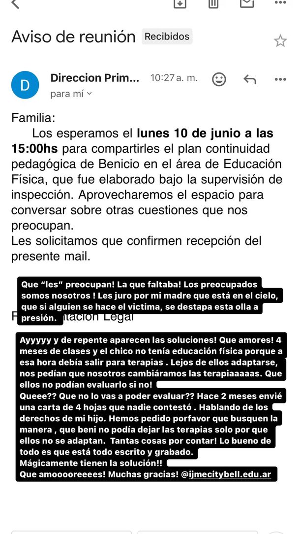 “Familia: Los esperamos el lunes 10 de junio a las 15 para compartirles el plan de continuidad pedagógico de Benicio en el área de Educación Física, que fue elaborado bajo la supervisión de inspección. Aprovecharemos el espacio para conversar sobre otras cuestiones que nos preocupan”, dice el correo.