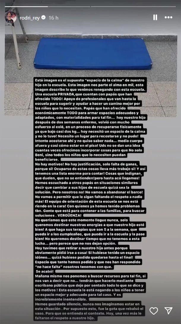 Se trata del Instituto José Manuel Estrada, de City Bell, adonde el menor concurrió tras dos semanas de enfermedad pero, al necesitar un “espacio de calma” debido al TEA, solo le ofrecieron una pequeña colchoneta. “No vamos a permitir que le sigan faltando el respeto a nadie más”, posteó el jugador en redes sociales.