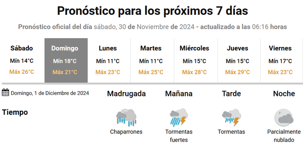 Por eso, antes del domingo lluvioso, los habitantes de la Ciudad de Buenos Aires y el conurbano bonaerense podrán disfrutar de una temperatura máxima estimada de 26 grados, mientras que la mínima rondará los 18.