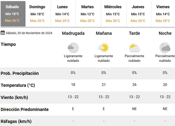 Con un cielo de ligera a parcialmente nublado, este sábado el viento soplará desde el Este hasta el mediodía, para luego hacerlo desde el Noreste durante la tarde. Sin lugar a dudas, será una jornada especial para los planes al aire libre, tanto de día como de noche.