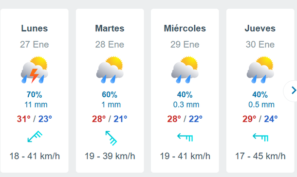 Otros pronosticadores adelantan que puede haber cuatro días consecutivos de lluvias en el AMBA, aunque el miércoles 29 y el jueves 30 de enero todavía los porcentajes de posibilidades de chaparrones están por debajo del 50 por ciento.