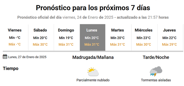 Mientras que el domingo se espera un día con mayor temperatura, con una mínima de 17 grados y una máxima de 27 grados.