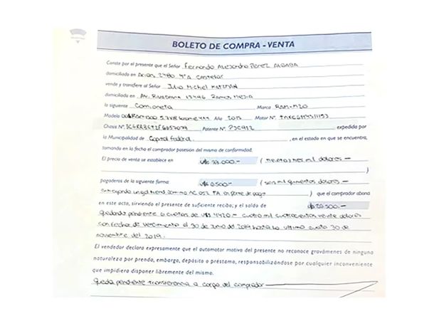 Entre los papeles, se encontró el contrato de alquiler de la concesionaria, firmado por Pérez Algaba con fecha de julio de 2017 y con un compromiso de 25 pagarés que iban de 11.500 a 30.500 pesos. También hubo pagos al Municipio de La Matanza por derechos de exhibir publicidad.