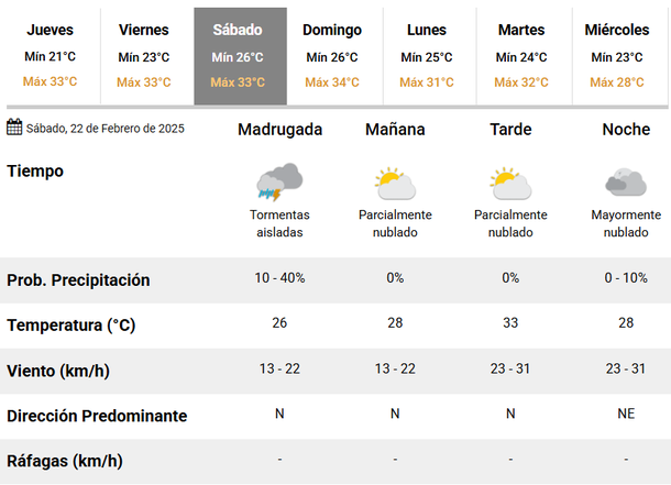 Del mismo modo, se espera que este sábado la temperatura máxima sea de 33 grados, con una mínima de 26 grados, y el pronóstico de algunas tormentas aisladas durante la madrugada.