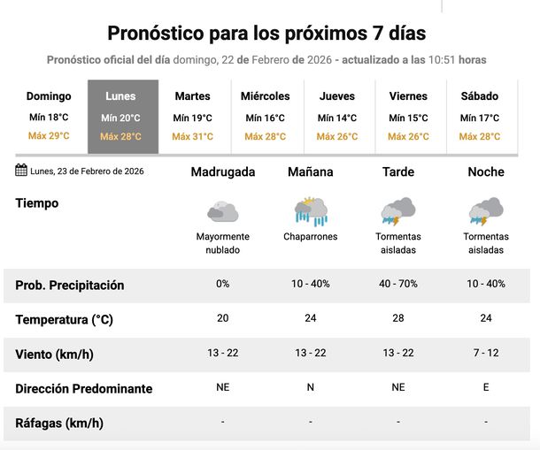 Según el informe del SMN, la inestabilidad se habrá presente desde este lunes, en una jornada que tendría cielo mayormente nublado, con probabilidad de chaparrones en la madrugada y tormentas aisladas en la tarde y noche. El termómetro rondará entre 20 y 28 grados.