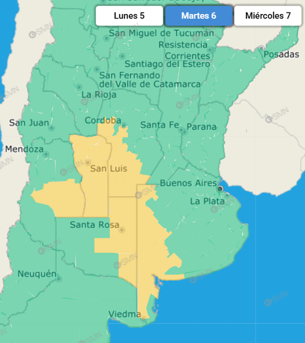 Los territorios del país que estarán afectados por la alerta amarilla de este martes son Buenos Aires, La Pampa, Córdoba, San Luis y Mendoza.