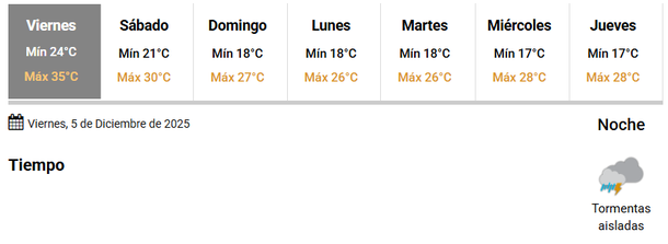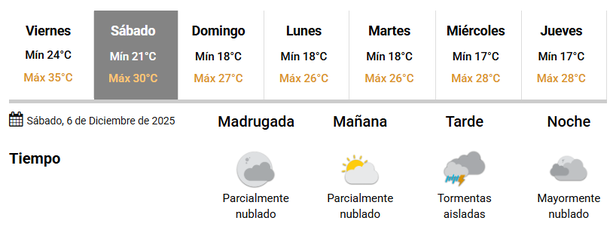 Además de que las temperaturas serán más benevolentes, para este sábado 6 de diciembre también se esperan tormentas aisladas que tendrán lugar durante la tarde. Mientras la mínima se ubicará en 21 grados, la máxima apenas tocará los 30, significando la antesala de días con mucho menos calor, en comparación a lo que ha sido esta semana.