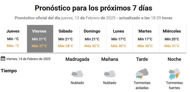 Y agrega: "Se prevén valores de precipitación acumulada entre 15 y 40 mm, pudiendo ser superados en forma puntual. S embargo, en el sur de Santa Fe, sur de Entre Ríos y Norte de la provincia de Buenos Aires los valores de precipitación podrían ser mayores, entre 50 y 70 mm.".