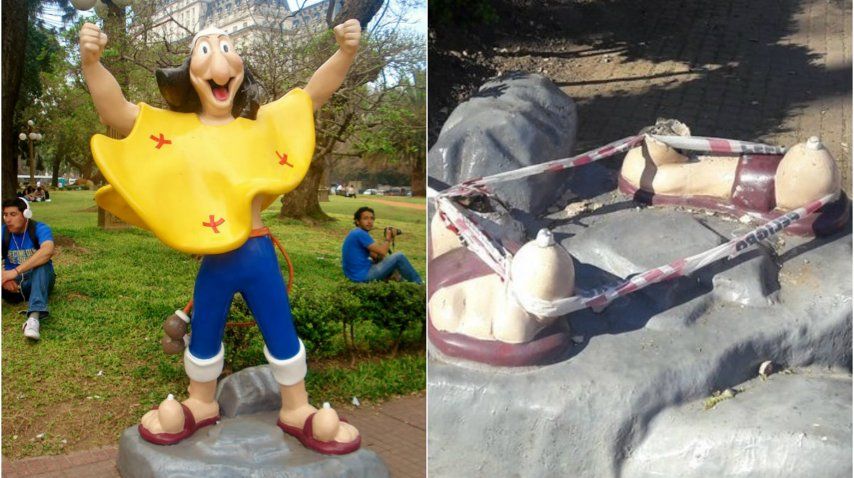 Los pies del cacique Tehuelche Paturuzú son el único rastro que queda de la estatuta del personaje creado por Dante Quinterno en 1928 en la esquina de Pase Colón y Belgrano, de dónde fue arrancada. Analizan las cámaras de seguridad para dar con las personas que robaron la escultura