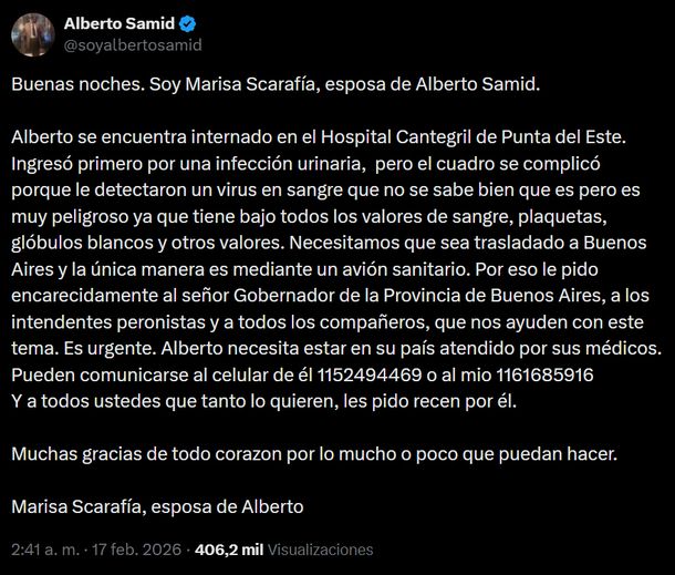 “Alberto se encuentra internado en el Hospital Cantegril de Punta del Este. Ingresó primero por una infección urinaria, pero el cuadro se complicó porque le detectaron un virus en sangre que no se sabe bien qué es pero es muy peligroso,ya que tiene bajo todos los valores de sangre, plaquetas, glóbulos blancos y otros valores”, describió Scarafía desde la cuenta de X de Samid.