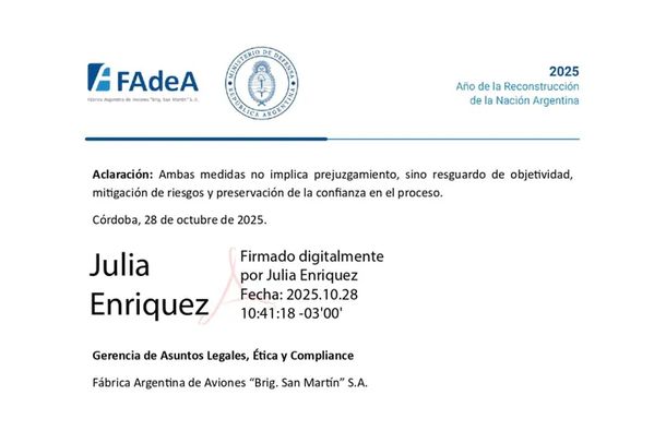 La alarma sonó entre el 19 y el 20 de agosto, cuando dos integrantes del cuerpo técnico de FAdeA, cuya planta se encuentra en Córdoba, presentaron sus denuncias ante la Gerente de Asuntos Legales, Ética y Compliance de la compañía, Julia Enríquez, a propósito de los supuestos manejos del entonces gerente comercial Pablo Salort, quien ya presentó su renuncia.