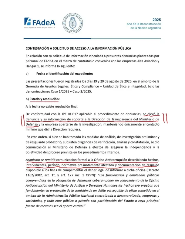 Como primera medida, Salort presentó su renuncia y el Directorio de FAdeA se la aceptó. Luego queda en manos de la Gerencia de Asuntos Legales, Ética y Compliance -y de la Oficina Anticorrupción- la elaboración de las investigaciones correspondientes.