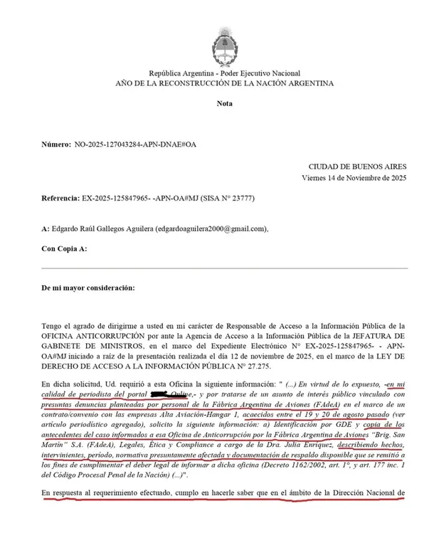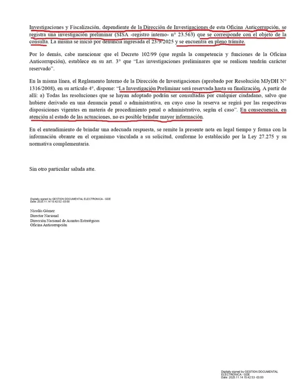 El caso ya fue remitido a la Oficina Anticorrupción, que informó al sitio Ámbito Financiero que la investigación preliminar "se encuentra en pleno trámite", y por lo tanto "será reservada hasta su finalización".