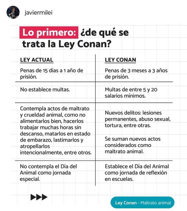 La Cámara de Diputados iniciará este miércoles el debate del proyecto de Ley Conan y el Presidente Javier Milei publicó un mensaje en sus redes señalando las diferencias de la nueva norma respecto a la anterior. La iniciativa busca penar con cárcel el maltrato animal.