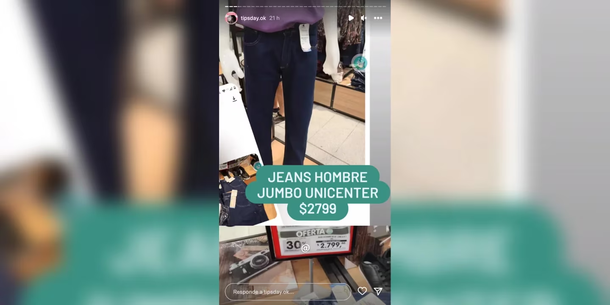 En este caso, la cuenta de Instagram Tips Day, encontró ofertas de pantalones jeans para hombres a menos de $3.000 en uno de los centros comerciales más reconocidos del país.
