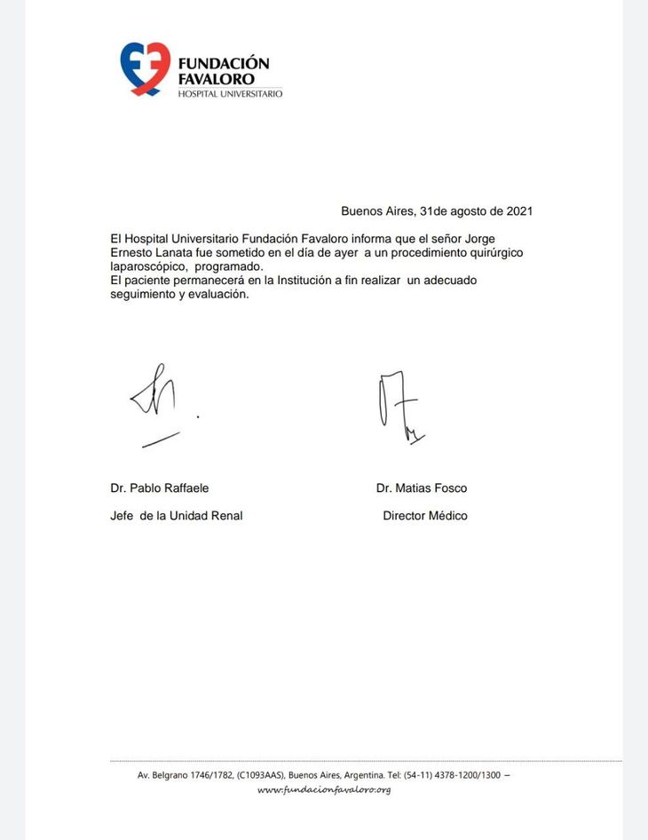 “El hospital Universitario Fundación Favaloro informa que el señor Jorge Lanata fue sometido en el día de ayer a un procedimiento quirúrgico laparoscópico programado”, dice el parte médico difundido por el centro de salud este martes.