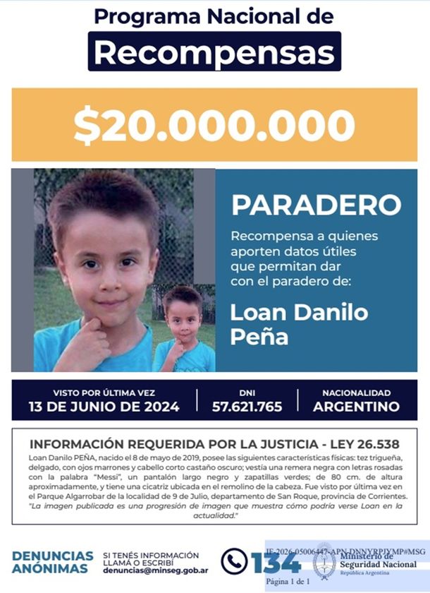El gobierno de Javier Milei elevó este viernes hasta 20 millones de pesos la recompensa para quienes brinden información que permita encontrar a Loan Peña. Así quedó plasmado en la Resolución 51/2026 publicada hoy en el Boletín Oficial con la firma de la ministra de Seguridad de la Nación, Alejandra Monteoliva.