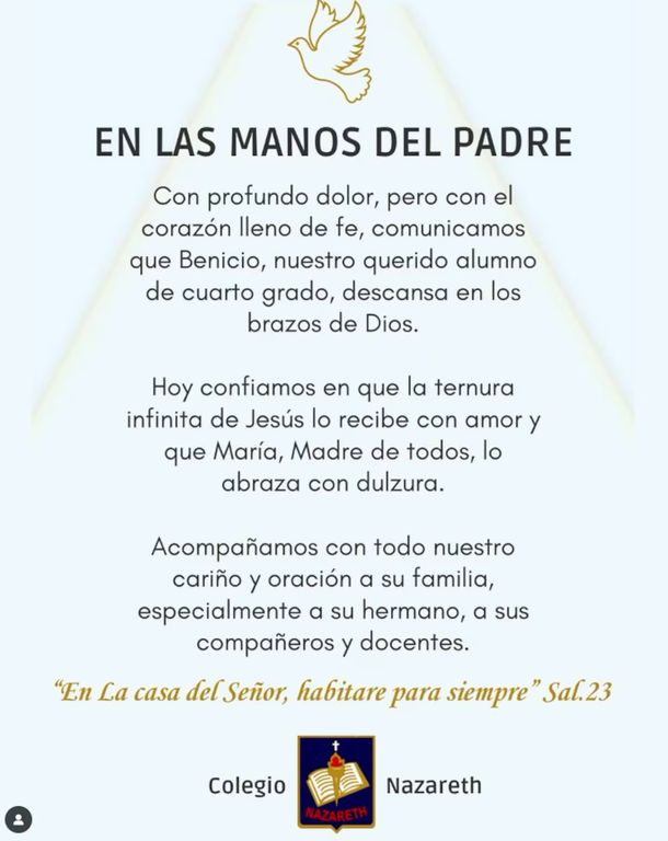 En tanto, desde el Colegio Jesús de Nazareth, del que el chico era alumno, se usaron las redes sociales para poner de manifiesto el dolor de la comunidad educativa: “Con profundo dolor, pero con el corazón lleno de fe, comunicamos que Benicio, nuestro querido alumno de cuarto grado, descansa en los brazos de Dios”.
