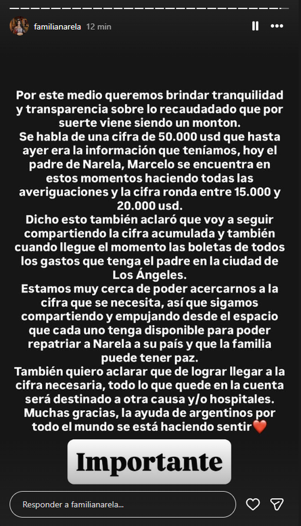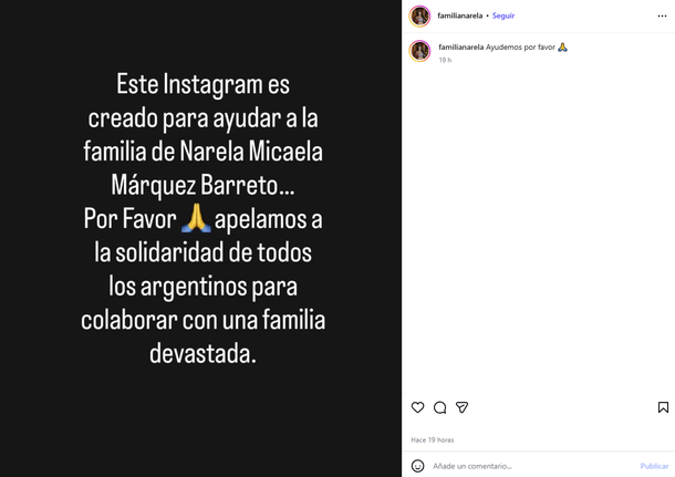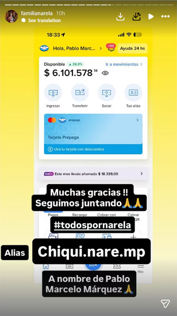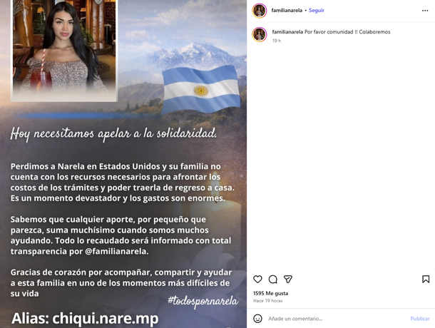 Ante esta situación, iniciaron una campaña solidaria y la familia habilitó la cuenta de Instagram @familianarela, donde se publican los datos necesarios para colaborar. En ese espacio también comparten mensajes de agradecimiento y actualizaciones sobre el avance de la colecta. Además, Santiago difundió el alias bancario chiqui.nare.mp para quienes deseen aportar económicamente.