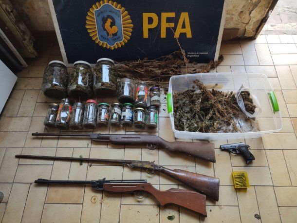 Durante el procedimiento y por orden de la justicia detuvieron al propietario de la casa, a quien le encontraron y secuestraron 15 frascos de vidrio conteniendo en su interior picadura de marihuana, dos rifles de aire comprimido, una carabina sin calibre, una pistola calibre .22 y dieciocho municiones calibre .38.