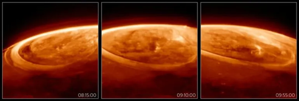 Desde la NASA explicaron que las auroras ocurren cuando partículas de alta energía entran a la atmósfera de un planeta cerca de sus polos magnéticos y chocan con gases en la atmósfera, lo que crea vibrantes espectáculos de luz. Las auroras de Júpiter tienen una fuente de energía adicional: su luna Ío, volcánicamente activa.