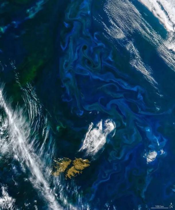 El Atlántico Sur, particularmente en la región de la plataforma patagónica, está experimentando transformaciones fascinantes. A fines del año pasado, los satélites de la NASA captaron una impresionante floración de fitoplancton cerca de las Islas Malvinas, destacando la riqueza biológica y la dinámica del océano argentino.