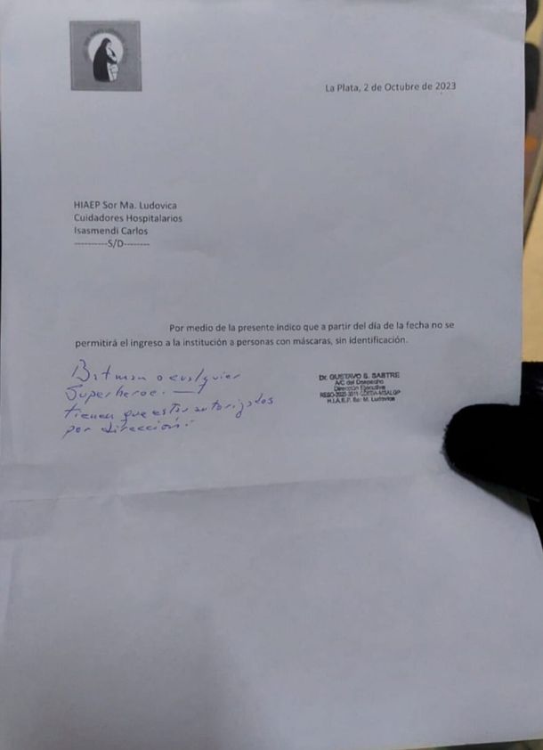 En el posteo, el Batman solidario de La Plata compartió una foto de la carta que le entregó el personal de seguridad en la que se indica: "Por medio de la presente, indico que a partir del día de la fecha no se permitirá ingreso a la institución a personas con máscaras, sin identificación".