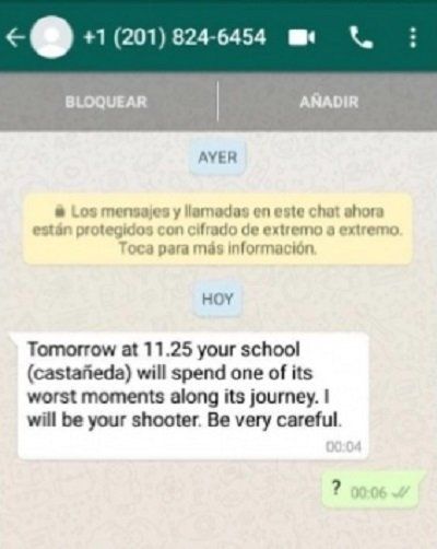 "Yo seré tu tirador. Ten cuidado", concluía la amenaza, que fue recibida por uno de los preceptores y también por varios alumnos del Secundario de la institución. Además de estar escrito en inglés, la característica del número pertenece a los Estados Unidos.