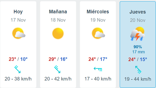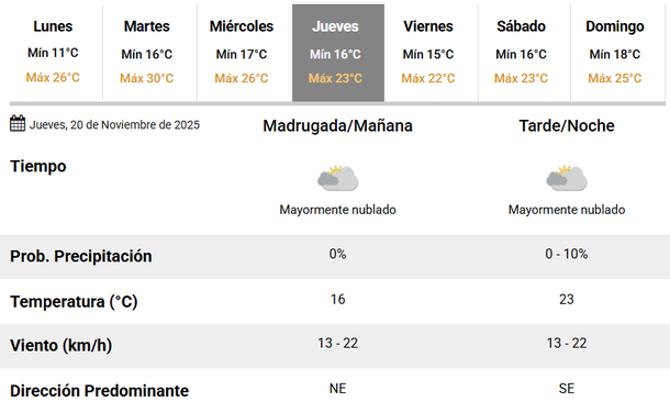 Para cerrar la semana, el viernes tendría cielo algo nublado durante toda la jornada, con temperaturas que rondarán entre 15 y 22 grados. El sábado tendría casi idénticas condiciones, de acuerdo con el organismo nacional.