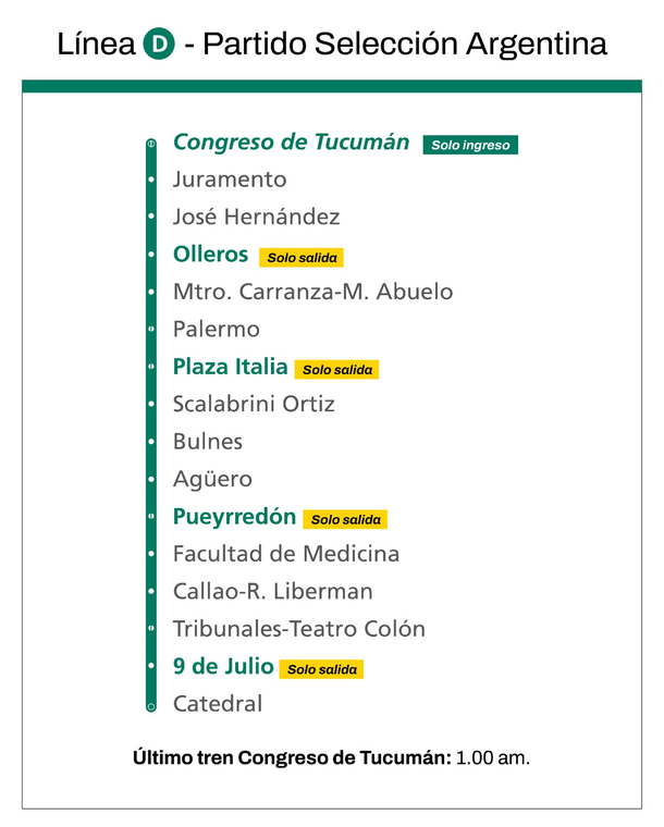 Por otro lado, ese mismo día, funcionará un servicio especial en la Línea D, para colaborar con la desconcentración del partido de la Selección Argentina, que se jugará en el Estadio Monumental. Para eso, la estación Congreso de Tucumán, la más cercana a la cancha, permanecerá abierta dos horas más.