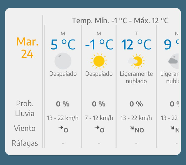 De acuerdo a lo señalado por el Servicio Meteorológico Nacional (SMN), alrededor de las 8 de la mañana se registrará la temperatura más baja que será de -1°, dado que es el momento del día en que amanece. Tras la salida del sol, el termómetro irá en ascenso, pero no mucho más que los 12 grados ya informados.