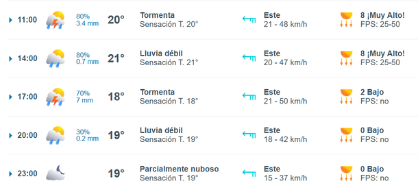 Por su parte, el sitio Meteored indica que entre las 11 de la mañana y las 14 horas serán las precipitaciones más intensas, continuando de manera similar hacia las 17. Luego, con la llegada de la noche, el caudal de agua se verá disminuido, lo que no significa el fin de las lluvias y tormentas, dado que el domingo también lloverá.