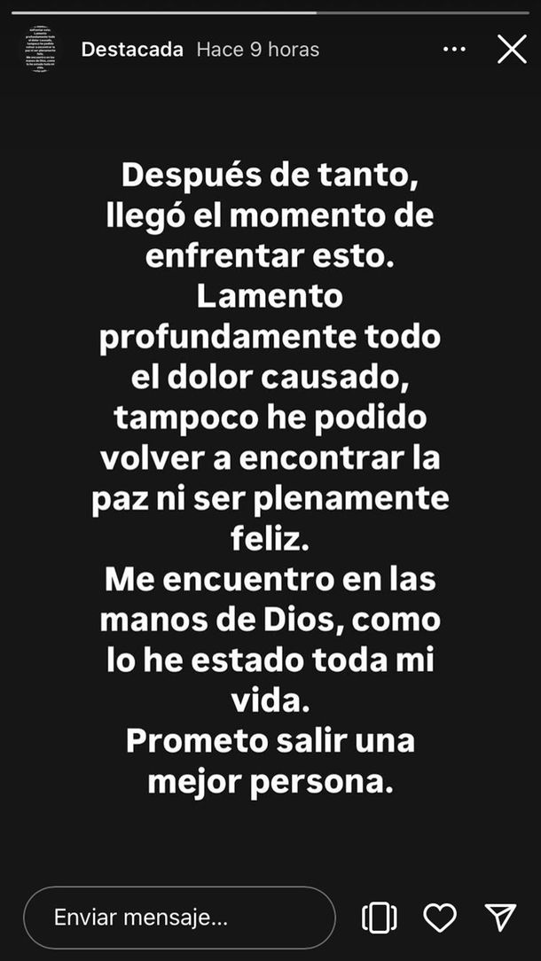 Y siguió: "Lamento profundamente todo el dolor causado, tampoco he podido volver a encontrar la paz ni ser plenamente feliz. Me encuentro en las manos de Dios, como lo he estado toda mi vida. Prometo salir una mejor persona”.
