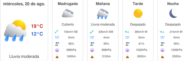 Para el jueves ya se esperan buenas condiciones del clima durante toda la jornada, con cielo algo nublado en las primeras horas y parcialmente nublado desde la tarde; acompañado de marcas térmicas de entre 7 y 19, sintiéndose una vez más el frío.