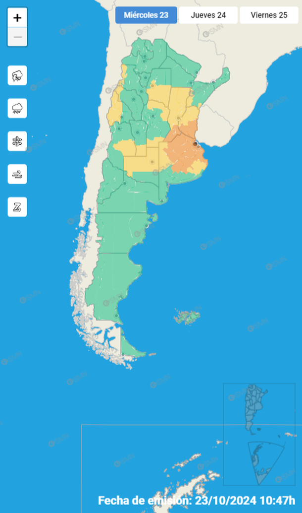 Gran parte de la provincia de Buenos Aires, incluida la zona del AMBA, está bajo alerta naranja este miércoles 23 de octubre de 2024 por lluvias y tormentas fuertes, con posible caída de granizo según informó el Servicio Meteorológico Nacional (SMN).