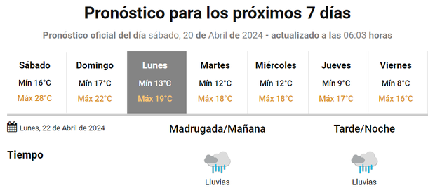Y para el lunes, que se esperaban lluvias por la mañana, mejorando el tiempo a partir del mediodía, también cambió porque la semana comenzará completamente pasada por agua, con temperaturas bajas.