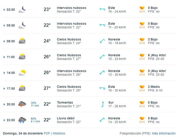 Por su parte, el sitio Meteored prevé tormentas para el domingo 24 de diciembre hacia las 20 y lluvia débil para las 23.