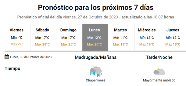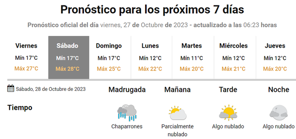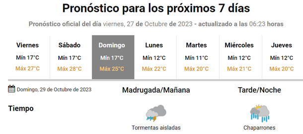 La mala noticia es que para el domingo 29 de octubre se esperan lluvias durante toda la jornada, sobre todo en horas de la mañana.