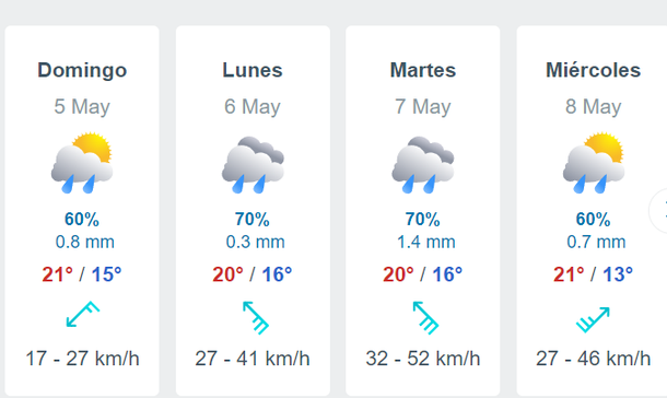 Las lluvias comenzarían el domingo se extenderían hasta el miércoles que viene, 8 de mayo. Y los porcentajes de posibilidad de chaparrones todos superan el 50 por ciento.