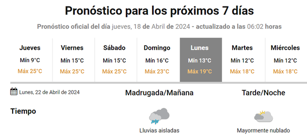 Por su parte, el SMN anuncia lluvias débiles el lunes 22 de abril por la mañana y por ahora no indica que se vaya a extender después del mediodía.