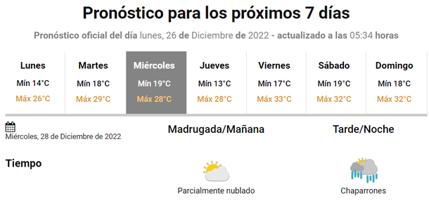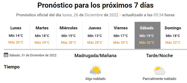 Tanto el sábado 31 de diciembre como el domingo primero de enero se esperan marcas térmicas similares, con mínimas cercanas a los 20 grados y máximas de más de 30.