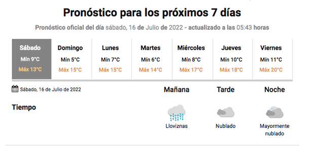 El Servicio Meteorológico Nacional (SMN) anuncia para este sábado 16 de julio de 2022 la posibilidad de lluvias y lloviznas. Con el correr de las horas irá mejorando el tiempo.