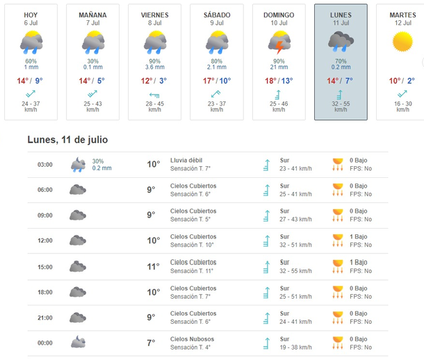 El sitio Meteored emite un pronóstico del tiempo extendido. Hasta el lunes, se espera frío y lluvia. La mínima se dará el viernes con 3 grados y la máxima el domingo con 18.