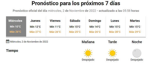 La postal del pronóstico de este miércoles se mantendrá al menos hasta el jueves de la semana que viene, el 10 de noviembre, primer día del mes en el que por la tarde podría haber lluvias y tormentas en Capital y sus alrededores.