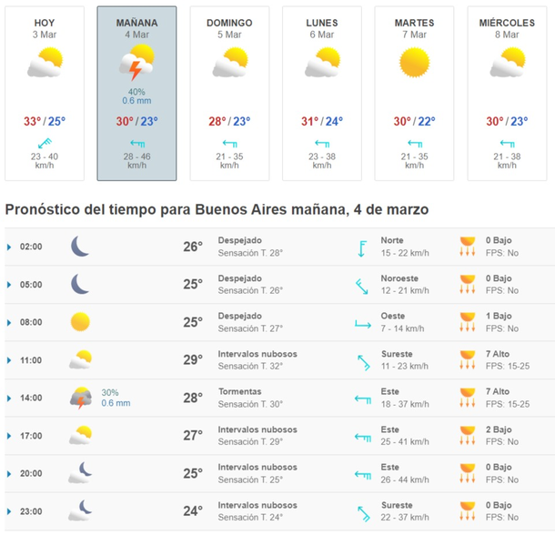Según el sitio Meteored, el sábado 4 de marzo a las 14 habrá tormentas en Buenos Aires. Los chubascos se extenderán por escasos minutos.