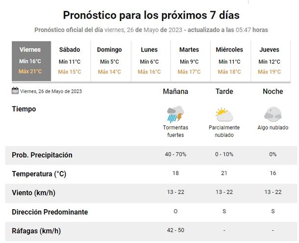 En tanto, para el sábado se prevé una temperatura mínima estimada en los 11 grados y una máxima de 15, cielo nublado a parcialmente nublado, vientos del sector sur y sin lluvias.