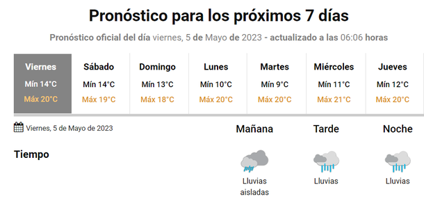 En tanto, para la jornada del sábado se esperan lluvias y tormentas durante toda la jornada, comenzando a mejorar a partir de la noche.