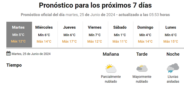 Para la Ciudad de Buenos Aires y alrededores, en tanto, se esperaba un martes con temperaturas de entre 4 grados de mínima y 12 máxima, junto a buenas condiciones del clima, aunque no se descartan lluvias por la noche.