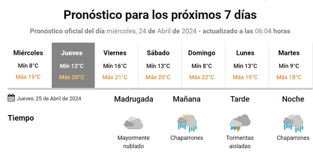 De todos modos, lo peor de las lluvias llegarían 24 horas después, el viernes 26 de abril, jornada en la que habría chaparrones y tormentas durante todo el día.